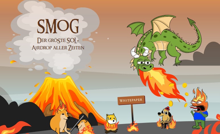 Der Smog Token ist ein neuer Krypto-Release, der Anfang Februar 2024 an der dezentralen Börse Jupiter veröffentlicht wurde. Smog ist dabei ein Meme Coin, der auf dem Meme des Drachen im Logo des Coins basiert. Das Projekt wurde auf der Solana Blockchain veröffentlicht und soll den größten Airdrop aller Zeiten herausbringen. Frühe Investoren sollen bei dem Airdrop reich belohnt werden! Der Hype um den Coin ist groß; in den ersten 36 Stunden nach der Veröffentlichung stieg der Preis bereits um mehr als 4.700%. Wer Smog Token kaufen möchte, sollte jedoch wissen, dass der Coin an sich keinen richtigen Nutzen und damit keinen echten Wert besitzt.