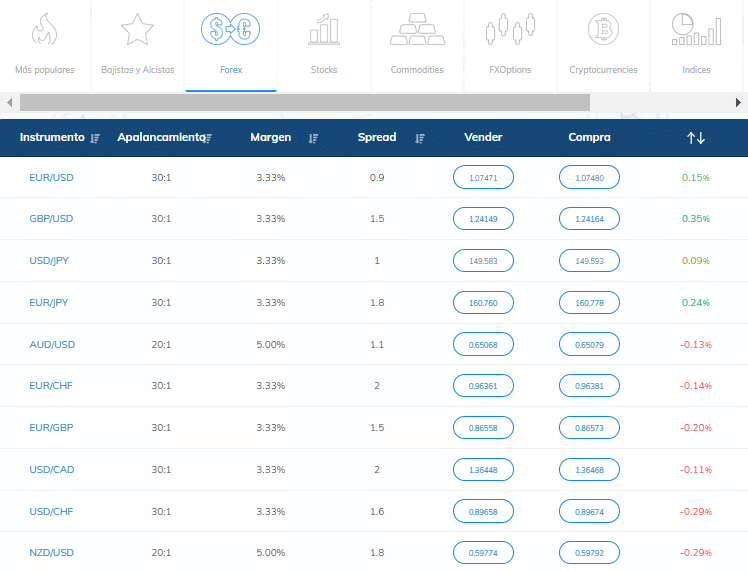 Como su nombre indica, este proveedor es una plataforma especializada en el comercio de divisas. Si abres una cuenta y haces un depósito, tendrás acceso ilimitado a más de 80 pares de divisas. Esto incluye una gran variedad de pares mayores, menores y exóticos.