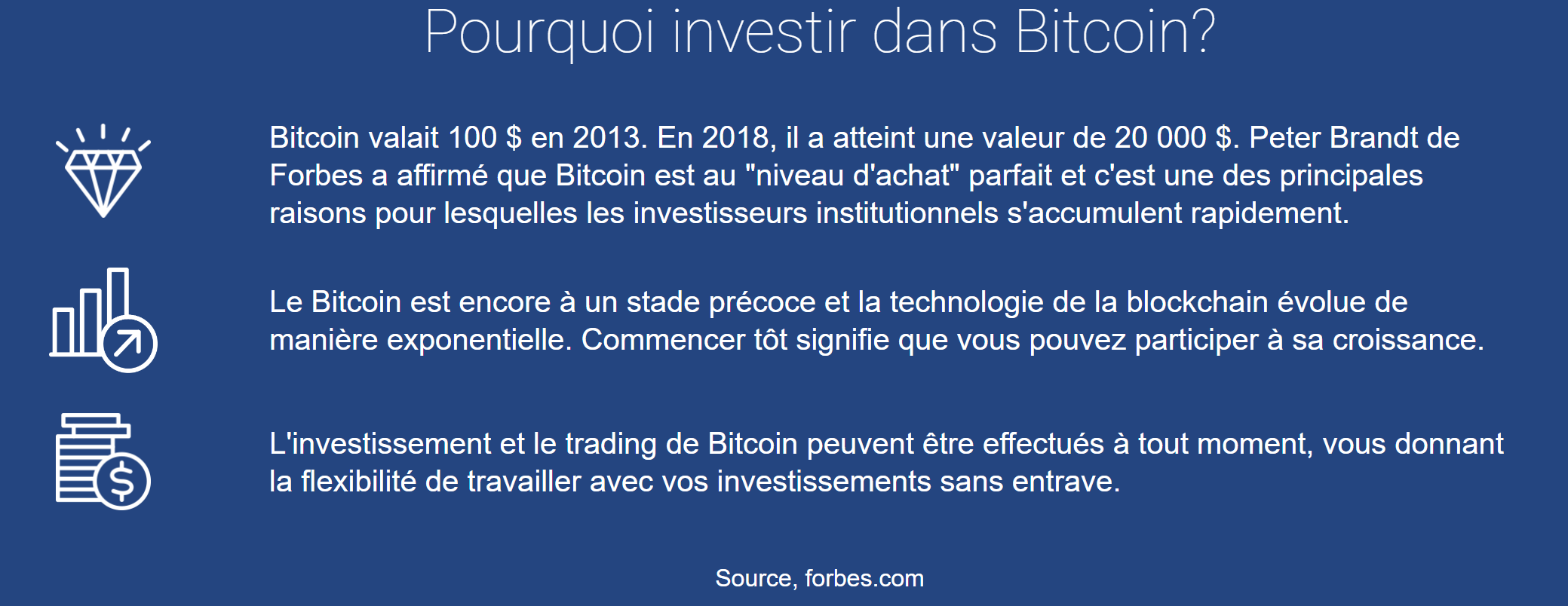 Idéale pour entamer l’investissement dans le Bitcoin avec l’aide d’experts.