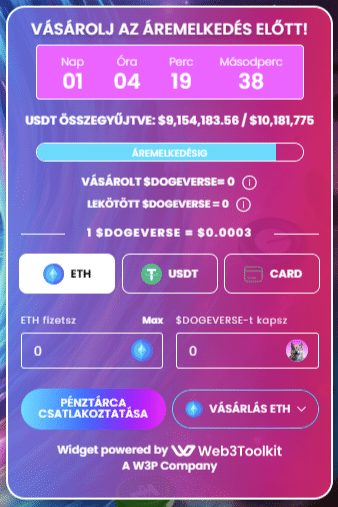 Elsőként keresd fel a Dogeverse előértékesítési honlapját. Az oldal tetején a következő elővásárlási widgetet fogod találni: