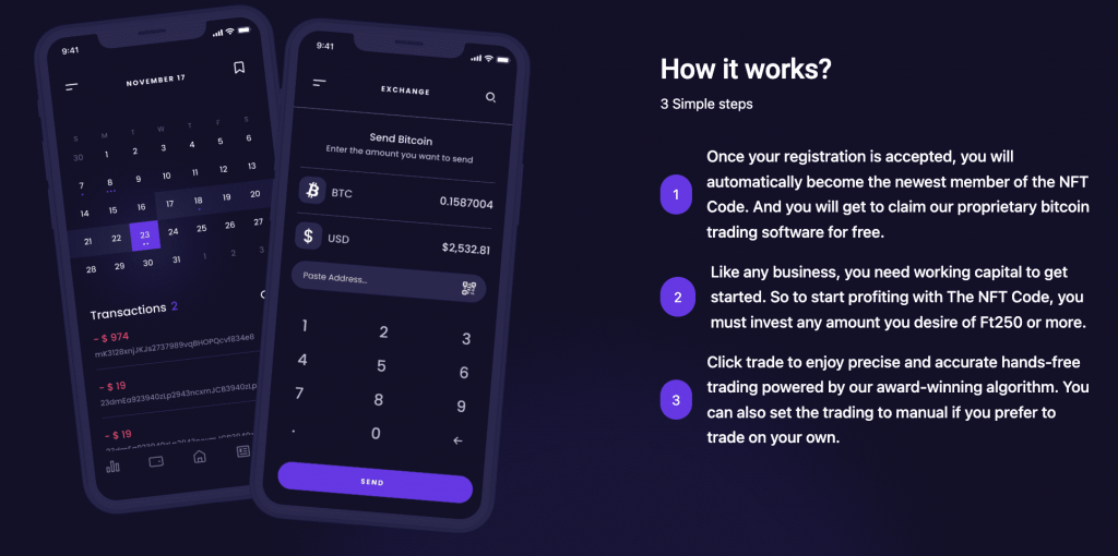 Az állítások szerint az ügyfeleknek csak napi néhány percet kell az NFT Code oldalán tölteni, az algoritmusok ugyanis automatikusan végrehajtják az eladást vagy a vásárlást, emberi beavatkozásra nincs szükség.