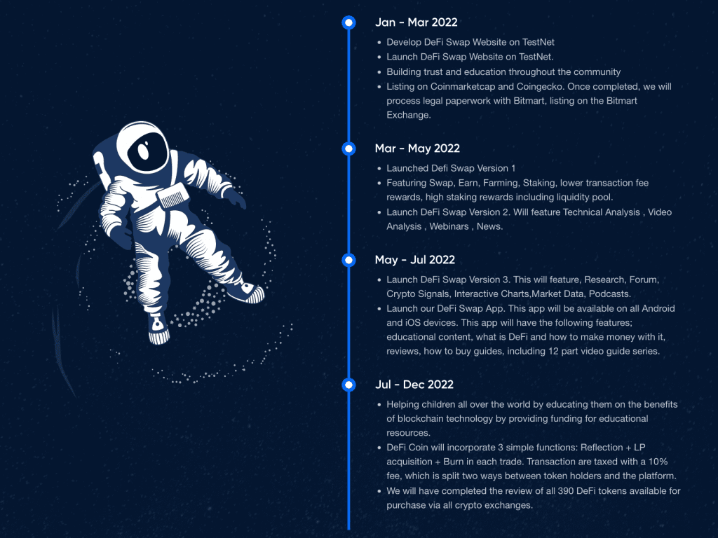 Oltre al white paper, spesso, tramite i canali ufficiali di un determinato progetto può essere diffusa una roadmap, che consiste in una pianificazione delle operazioni da effettuare nel breve periodo, generalmente considerando un intervallo di almeno 12 mesi. Sulla pagina ufficiale di DeFi Coin è possibile raggiungere sia il white paper di DeFi Swap che la roadmap relativa all’anno 2022/2023.