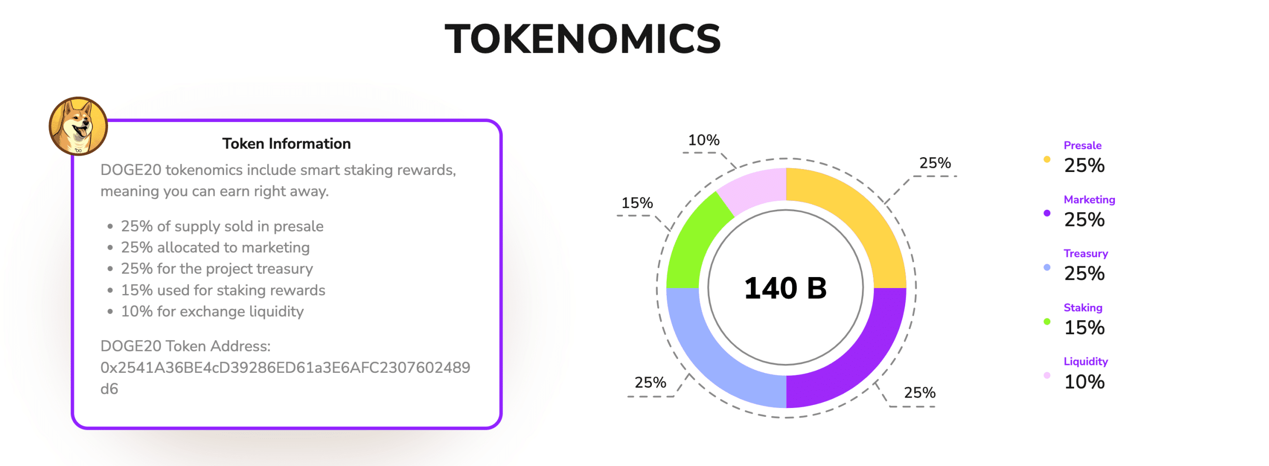 Samotný token $DOGE20 beží na blockchaine Ethereum a využíva mechanizmus Proof-of-Stake. Používatelia sa môžu pripojiť k rýchlo rastúcej komunite, využívať výhody spoľahlivých a ekologických transakcií a zarábať prostredníctvom stakingu až dva roky. Tvorcovia projektu Dogecoin20 vyčlenili až 15 % celkovej ponuky na účely stakingu (12,5 % v prvom roku, 2,5 % v druhom roku). Ďalších 25 % z celkovej zásoby je určených na predpredaj, 25 % na marketing, zvyšných 25 % na prevádzku projektu a 10 % na likviditu na burzách.