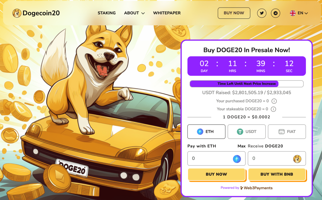 Nový meme coin Dogecoin20 si získal srdcia všetkých investorov, ktorí hľadajú lacnú kryptomenu s pridanou hodnotou. V súčasnosti sa token $DOGE20 nachádza v predpredaji a investori tak majú najlepšiu príležitosť kúpiť si Dogecoin20 za najnižšiu cenu.