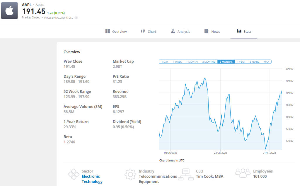 You can find Apple stock analysis on eToro by searching for the Apple ticker symbol, APPL. Here, you will be able to view past performance, technical analysis, market news, and much more.