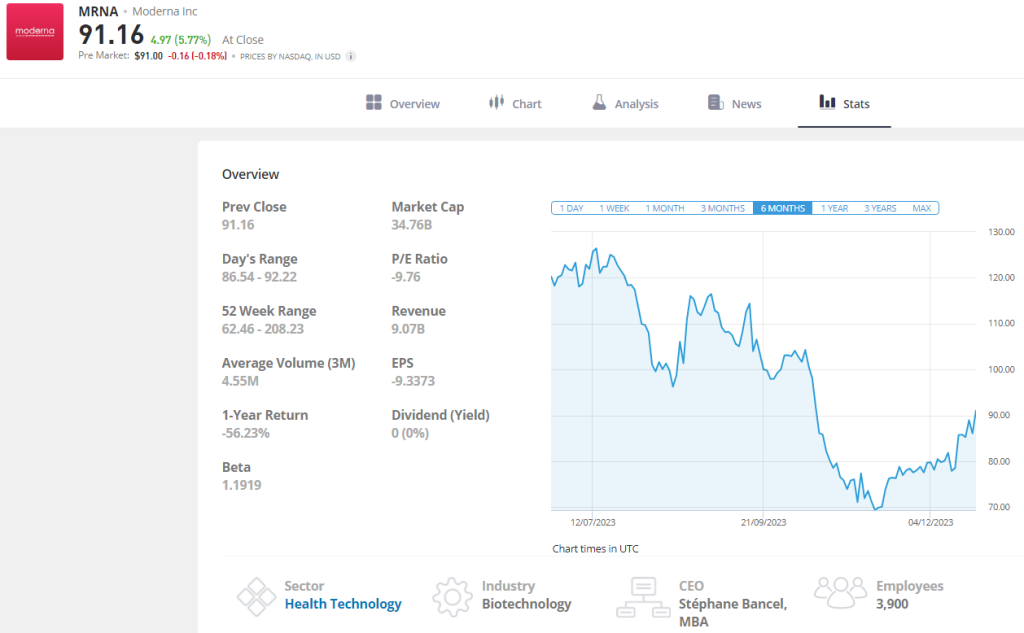 At the time of writing in December 2023, Moderna stock sits at $91.16 per share