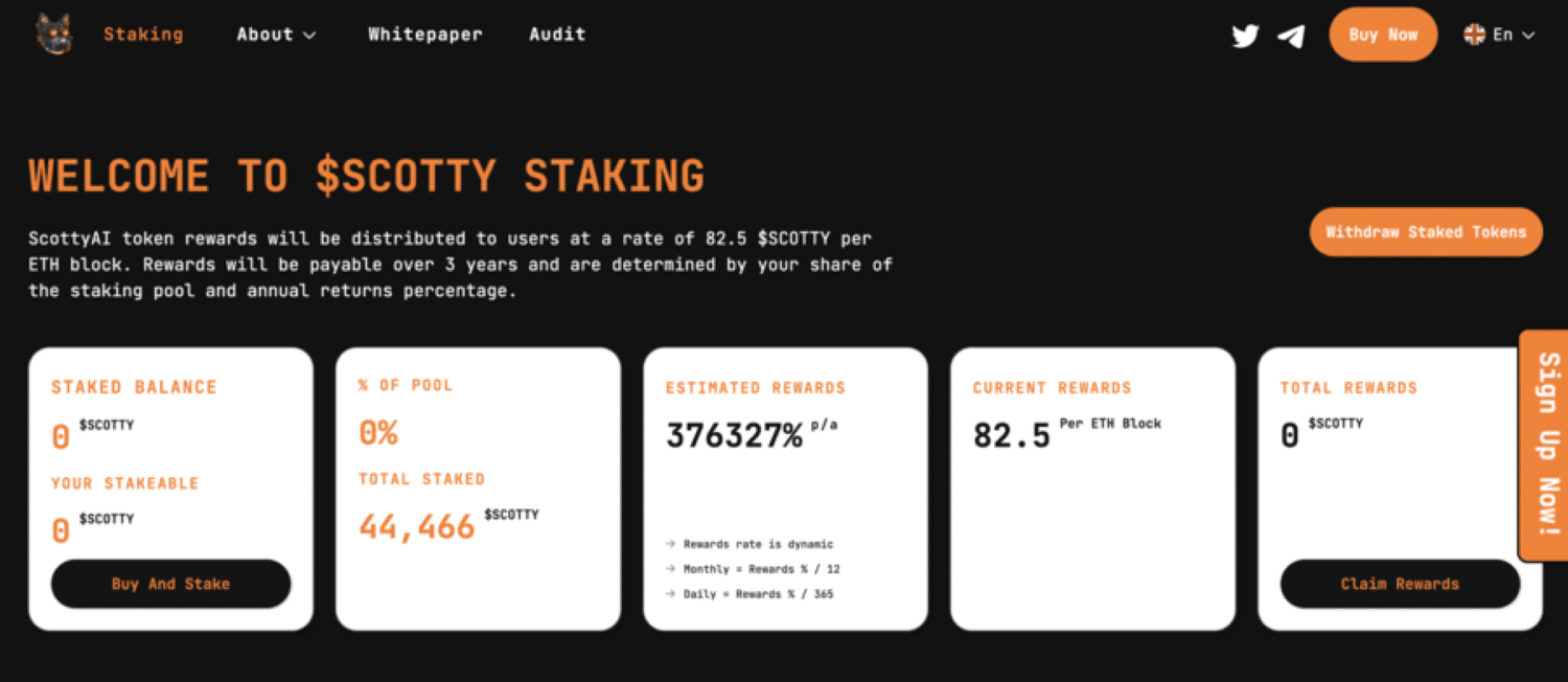 Staking oranlarında da güvenen proje, ilk ön satuş aşamasında %376,327 oranında faiz oranlarına sahipti. Yakın zamanda ScottySwap ve ScottyChat platformlarını da devreye sokacak olan proje ekibi bu şekilde yapay zeka kullanımını arttıracak.