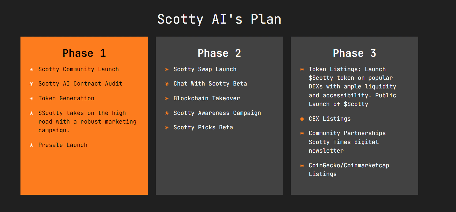 Proje ekibi, Scotty the AI’ın uzun vadeli kripto yatırımı için de tercih edilen bir alternatif olması için geleceğe yönelik kapsamlı bir yol haritası oluşturmuş durumda. Başlangıç aşamasında Scotty tokenın topluluğa sunulması, Scotty AI sözleşmesinin denetlenmesi, token çıkarma, tanıtım ve ön satış gibi farklı konulara odaklanılıyor. Yazı yazılırken Scotty AI sözleşmesi Coinsult tarafından onaylanmıştı.